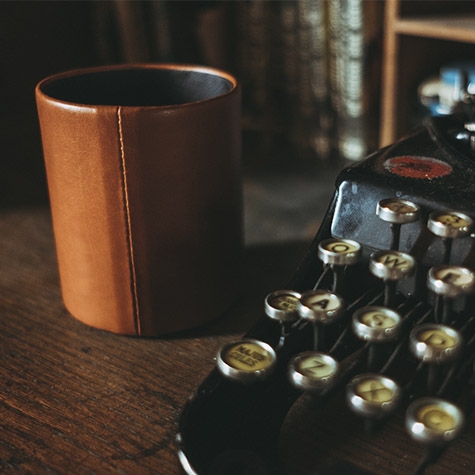 Round pencil tin. Dimensions: 10 x 8 cm. OSLO Collection: premium cow leather products designed and handcrafted in Barcelona. Available in natural leather color, dark brown, black and red. This product can be personalised with a name or company logo.